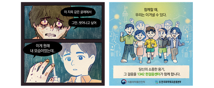 인쇄물 부문 우수작 「용기의시작, 1342」는 홍보툰 형식으로 제작되어 중독 이전 건강했던 모습을 갈망하며 홀로 후회할 때, ‘또 다른 나’가 전하는 격려로 용기내어 한걸음센터에 다가가는 과정을 그린 작품으로, 참석자들은 “메시지가 직관적이고 회복의 용기를 잘 전달한다”고 평했다.
